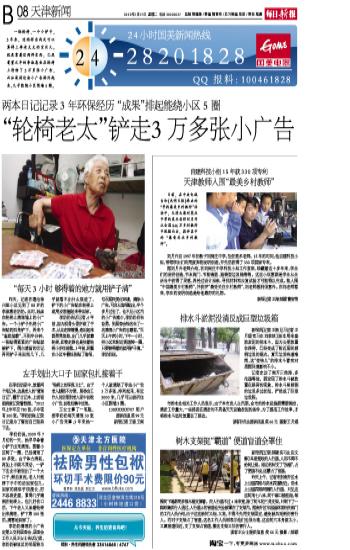 李奶奶說,2009年7月初的一天,她早早拿著小鏟子出來清理。圍著小區轉了一圈,已經清理了80多張。由于體力消耗,再加上手腳不靈活,一鏟下去左手被劃出了一個大口子,鮮血直流,老人只能停下手中的活回家包扎。回家的路似乎很漫長,好不容易進屋,累得幾乎癱倒在輪椅上。包扎好傷口后,下午老人又坐著輪椅出來清理,鏟下第100張后,滿意地回家了。