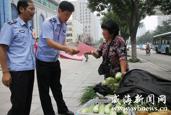 昨日,在市區青島北路,兩名行政執法人員給一位進城果農發放“倡議書”,并要求其自覺到指定區域經營。記者 于啟波 攝